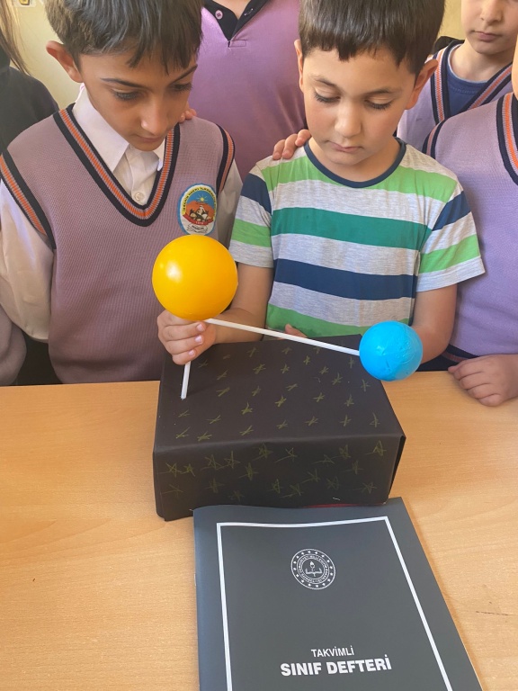 4/A sınıfı öğrencileri, öğretmenleri Büşra Yeliz Buber Kaba eşliğinde Fen Bilimleri dersi Dünya'nın dönme ve dolanma hareketini modellediler.